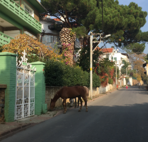 Burgazada, Sait Faik’in heykeliyle karşıladı bizi. Güneş sağolsun yalnız bırakmadı hiç. Sararan yapraklarda, kızarmış sarmaşıklarda, ağaçların gölgelediği sokaklarda, kuru yaprakların kapladığı merdivenlerde güneşle ısındık. Abartıdan uzak, mütevazi güzellikleriyle evler; yeşil balkonlu apartmanın önünde gezinen atlar, balkona nazar boncuğu asmayı hakeden güzellikteki beyaz köşk, bir yol ayrımında ortada kalakalmış incecik bir bina, sağında bisikletini sürükleyerek geçen yaşlı adam, sokak aralarında yürüyüşe çıkmış martılarla kargalar…